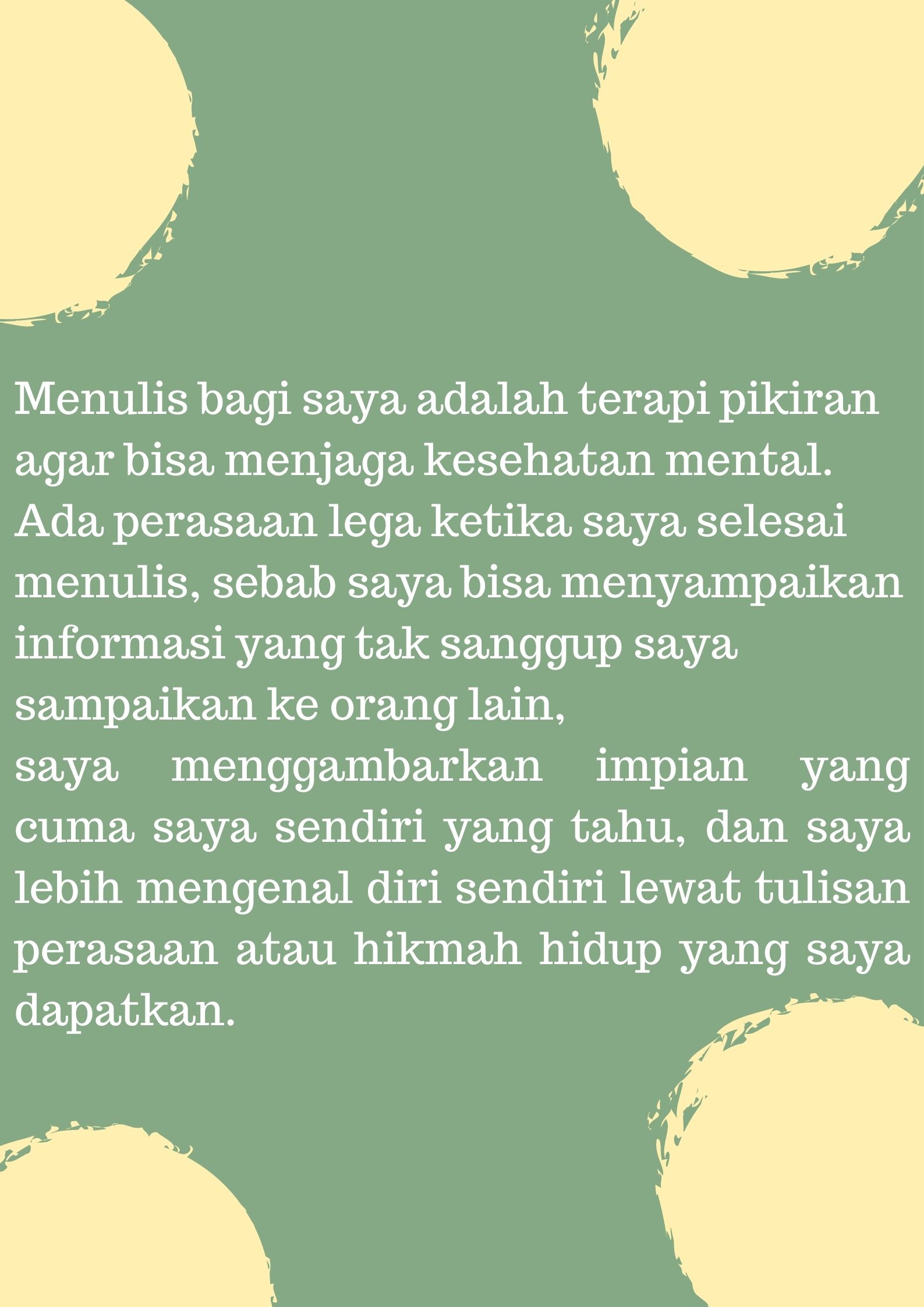 Menulis merupakan rutinitas yang sering saya lakukan. Setiap keresahan, ide, dan gagasan yang terlintas di pikiran, maka sudah pasti saya tuliskan di handphone atau buku catatan harian. Itulah kenapa, tulisan yang biasa saya tulis adalah perwujudan dari konten apa yang saya konsumsi, buku apa yang sedang saya baca, serta kondisi apa yang tengah saya alami. Menulis bagi saya adalah terapi pikiran agar bisa menjaga kesehatan mental. Ada perasaan lega ketika saya selesai menulis, sebab saya bisa menyampaikan informasi yang tak sanggup saya sampaikan ke orang lain, saya menggambarkan impian yang cuma saya sendiri yang tahu, dan saya lebih mengenal diri sendiri lewat tulisan perasaan atau hikmah hidup yang saya dapatkan.
